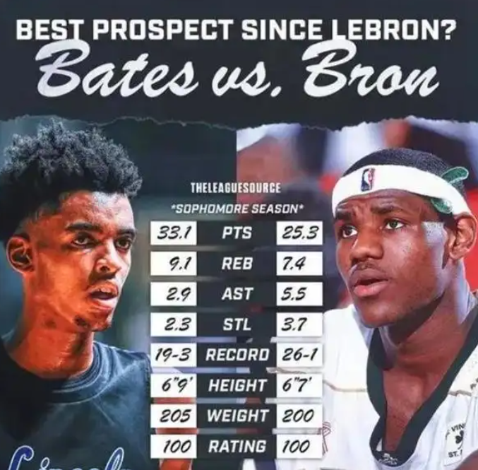 那时的贝茨,是美国篮球圈的 “天选之子”。体育画报将他与魔术师、乔丹、詹姆斯并列,封面上那句 “Magic, Michael, LeBron, and Bates” 像一道惊雷,炸响在整个篮球圈。13岁名扬全美,七年级场均 46 分,高一场均 28.5 分 10.2 篮板率队夺冠,高二单场轰下63分21篮板 —— 这样的履历,让人们坚信他会是下一个划时代的巨星,喊出 “上限杜兰特,下限麦迪” 的狂言。但是贝茨成为NBA著名的伤仲永之一,结果令人遗憾!